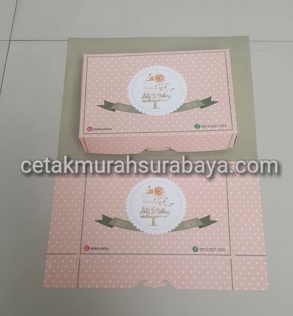 Gambar di atas adalah contoh Kemasan/Dus Kotak Donat/Roti dengan ukuran 27x18x5 cm menggunakan kertas bahan Ivory 300gr. Anda dapat menggunakan laminating glossy pada bagian dalam untuk hasil lebih mengkilat dan lebih tahan minyak.